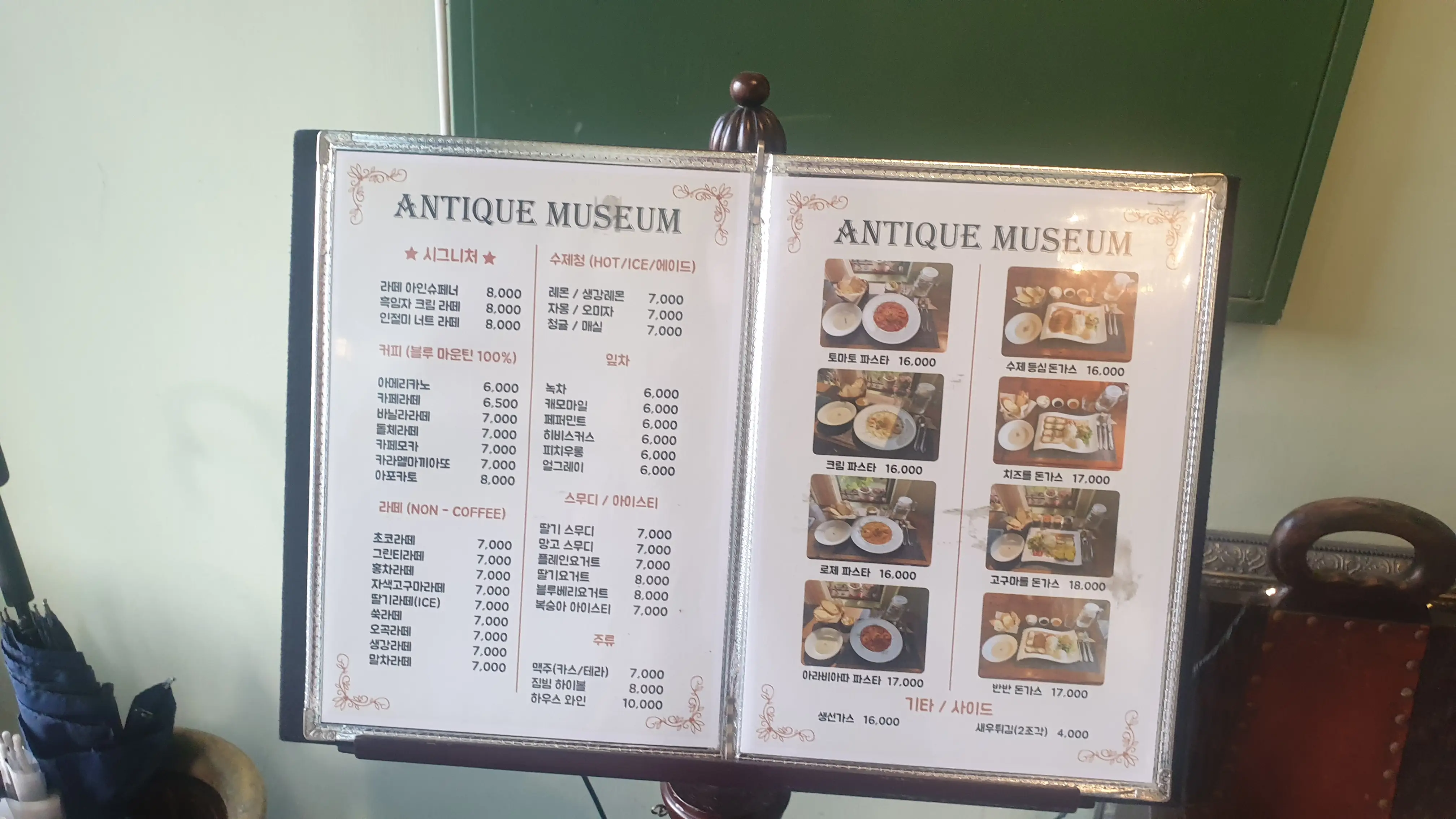 앤틱뮤지엄 카페의 메뉴입니다. 음료뿐만 아니라 파스타와 돈가스등의 식사메뉴도 있습니다. 저는 총 2번 방문했는데 항상 음료만 먹었습니다. 다음에는 식사도 한번 해봐야겠습니다. 참고로 식사주문은 오후 7시 30분까지 받는다고 합니다.