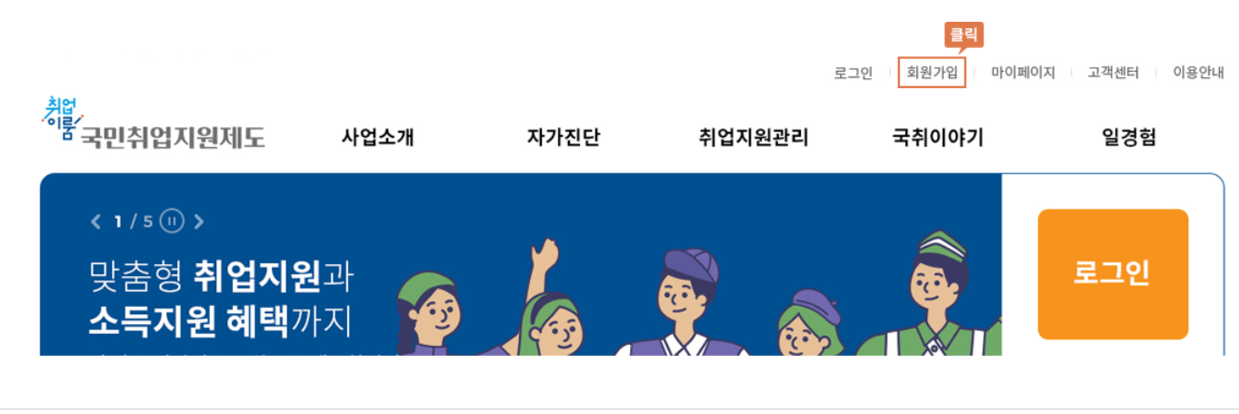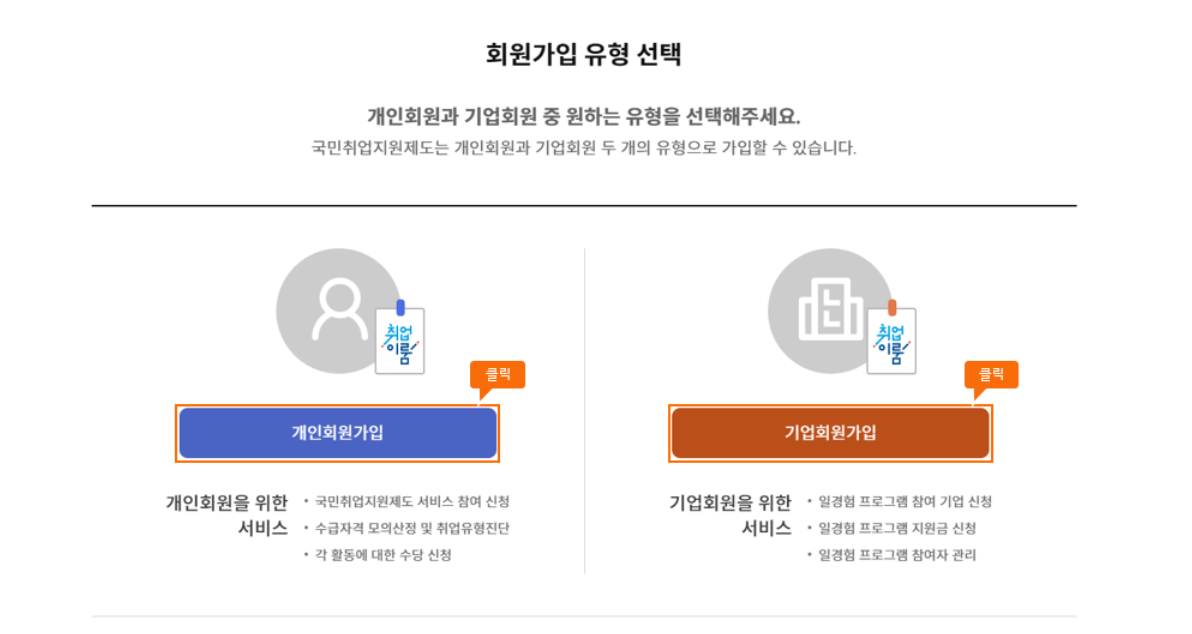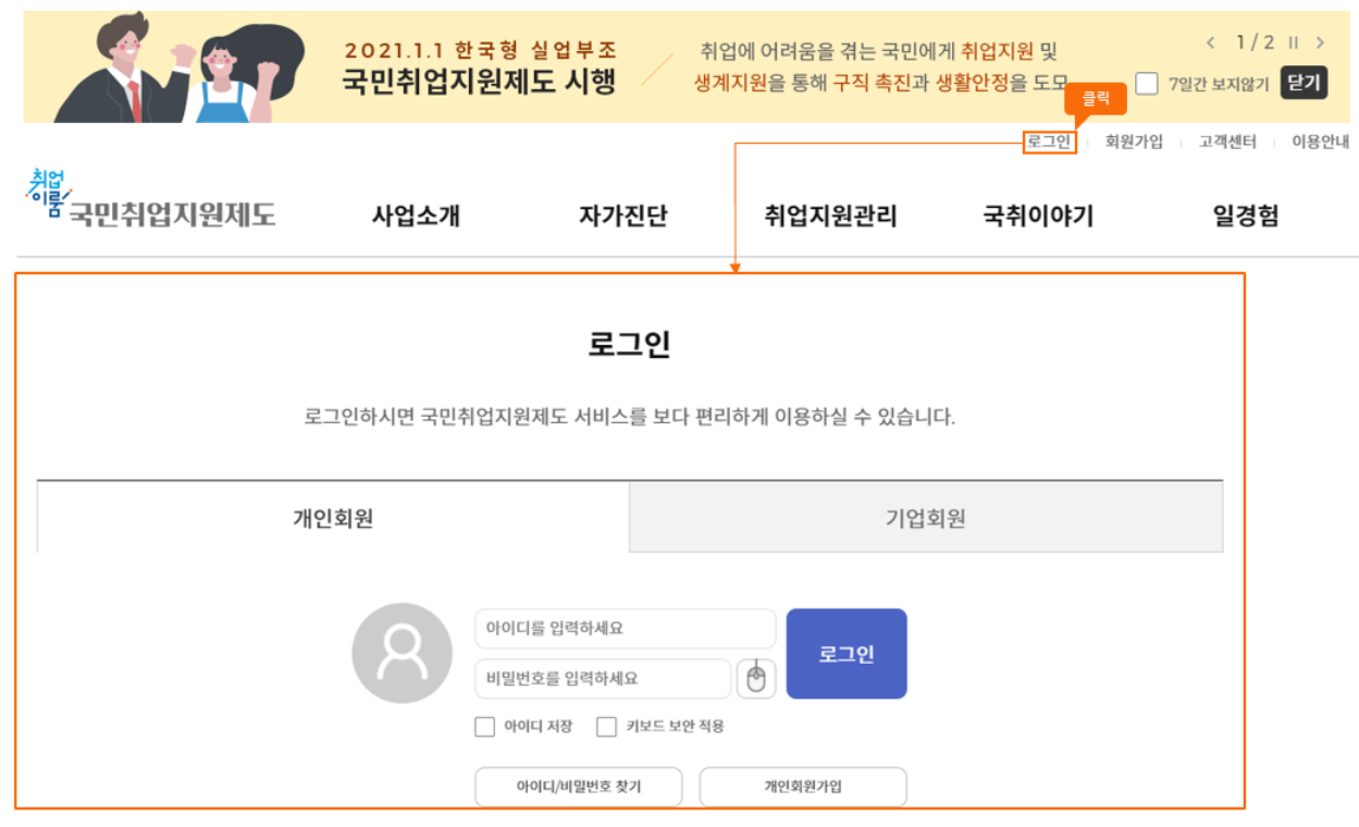 - 국민 취업지원제도에 참여 신청 시 : [개인회원] 클릭