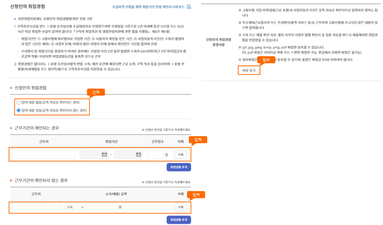 [신청인의 취업경험]은 최근 2년 이내 취업경험이 100일(또는 800시간) 이상 또는 미만 여부에 따라 수급자격 인정이 달라집니다. 신청인 본인의 취업경험을 입력 시 고용보험 취득/상실 증빙은 제외하고 추가가 필요한 사항을 입력하고 증빙자료를 첨부합니다.