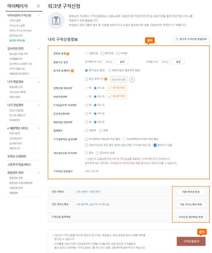 -> 워크넷 마이페이지 좌측 메뉴의 [워크넷 구직신청] 클릭