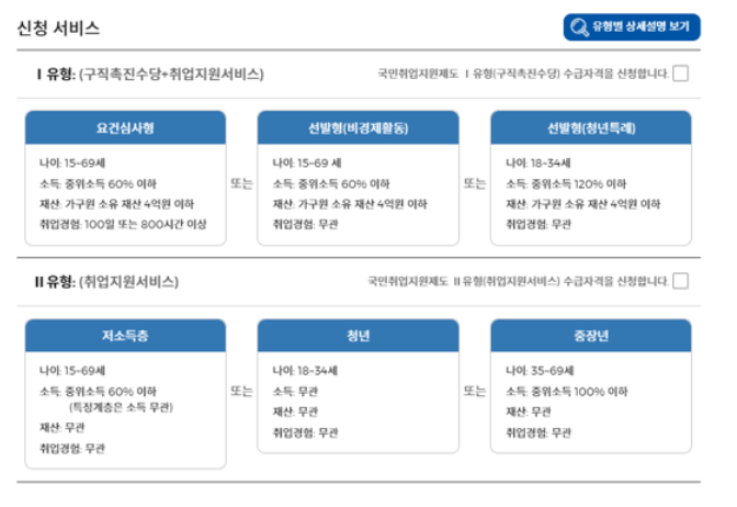 | ▶요건심사형: 15~69세 구직자 중 가구단위 중위소득 60% 이하이고 재산 4억원 이하이면서, 최근 2년 안에 100일 또는 800시간 이상의 취업경험이 있는 사람 ▶선발형: 요건심사형 중 취업경험요건을 충족하지 못한 사람(단, 18~34세의 청년은 중위소득 120% 이하, 취업경험 무관) ※ 구직촉진수당(50만원x6개월) 및 취업지원서비스 제공 |