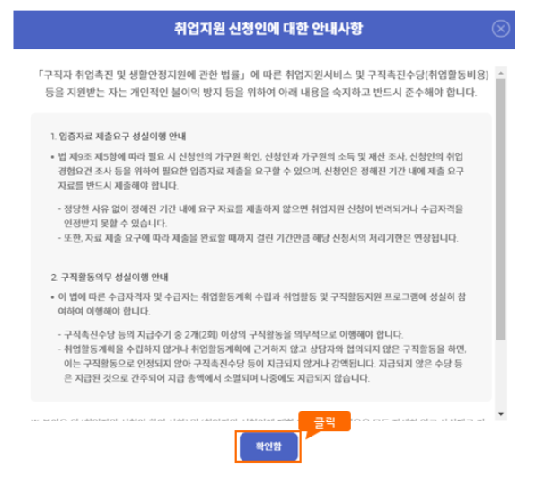 - [신청하기] 버튼을 클릭하시면 신청이 완료되기 전에 [취업지원 신청인에 대한 안내사항] 팝업이 뜨고 필히 안내사항을 확인하신 다음 [확인] 버튼을 클릭해야 최종 신청이 완료됩니다.