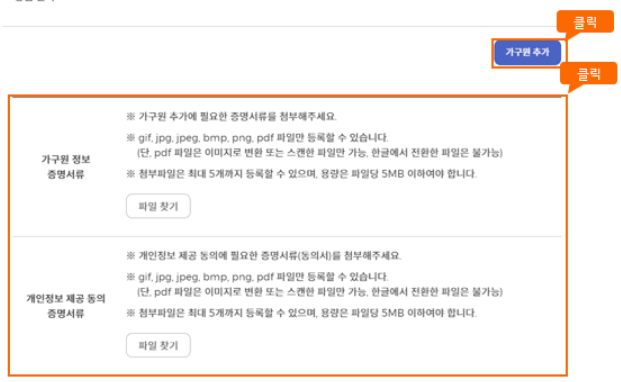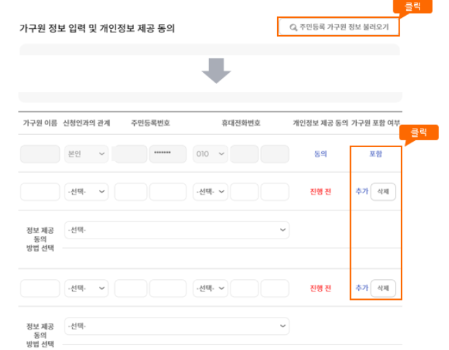 - STEP2에서 가구원 정보 등록을 위해 [주민등록 가구원 정보 불러오기] 버튼을 클릭하시면 공공전산망의 주민등록등본상 가구원 정보가 자동으로 표시됩니다. 가구원 중 제외가 필요한 경우 [삭제] 버튼을 클릭하면 사유 입력 후 제외가 가능하며 우측 하단의 [가구원 추가] 버튼을 클릭하면 추가가 가능합니다. 이 경우 가구원 추가/제외에 필요한 증빙자료를 하단 항목에 파일로 등록하시기 바랍니다.