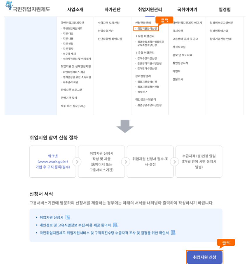 - 취업지원관리의 ‘취업지원 참여 신청’ 메뉴로 이동