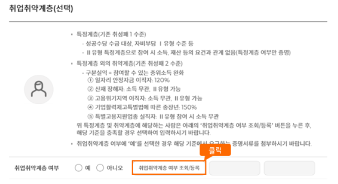 신청인 본인이 취업 취약계층에 해당하는지 여부를 [취업 취약계층 여부 조회/등록]을 통해서 조건 및 필요서류를 확인하고 선택정보를 입력하실 수 있습니다.