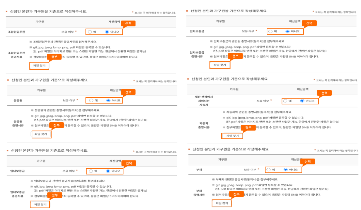 [가구원별 재산 추가 등록]은 재산 심사에 있어 공제가 필요한 항목에 대해 입력 후 증빙을 첨부하시면 수급자격인정심사 진행 시 공제 여부를 확인 후 재산 공제 처리가 가능합니다.