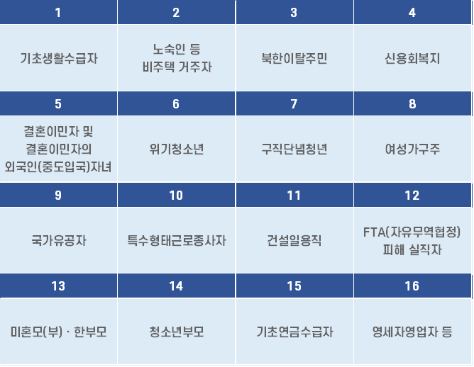 - 정부 재정지원 직접 일자리에 참여하고 있거나 참여 종료 후 6개월이 지나지 않은 사람