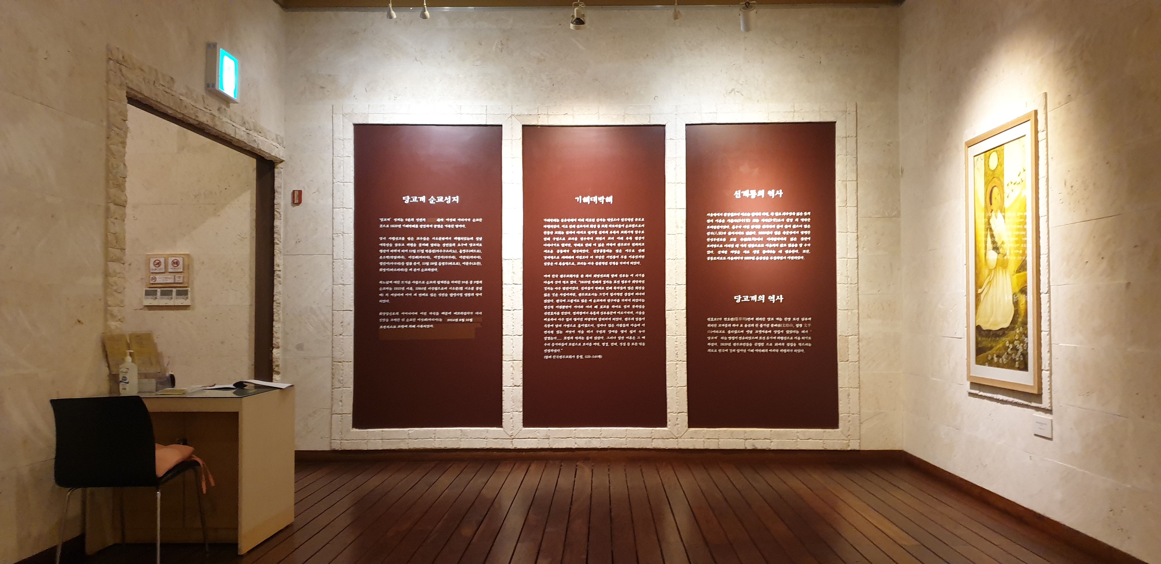 사무실 옆쪽으로 들어가시면 전시관과 기도실이 있습니다. 이곳에는 당고개 순교 성인들의 그림이 한국적으로 그려져 있습니다. 기도실도 조용히 묵상 기도하기 좋은 곳입니다.