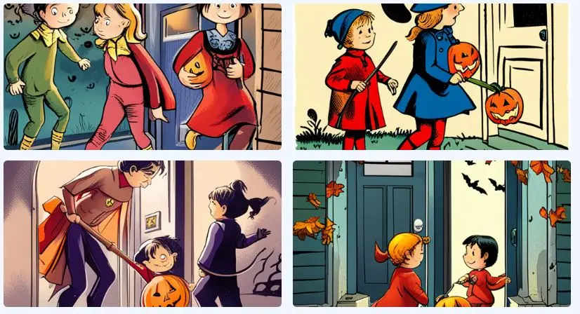 어린아이들이 핼러윈 코스튬을 입고 동네를 돌며 사탕을 얻는 장면을 만화로 그려줘. 아이들은 호박 퐁당과 함께 하고 있으며, 얼굴에는 미소가 지어져 있다.