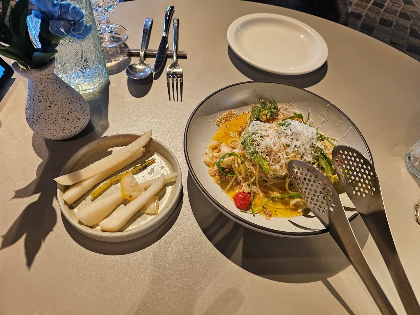 저는 갑오징어 파스타와 시그니처메뉴인 김치볶음밥을 시켰습니다. 두 메뉴 다 맛있었습니다.
