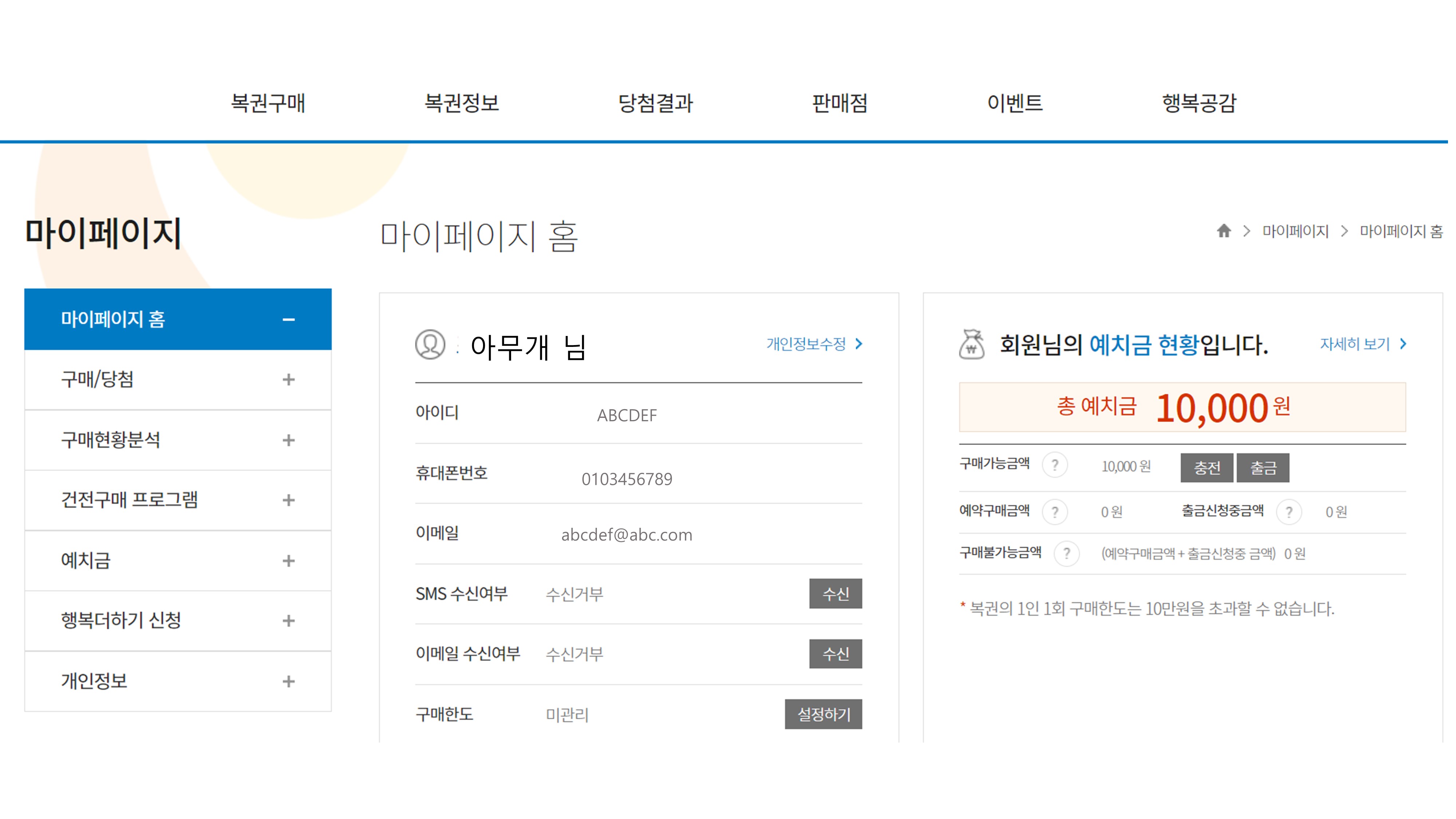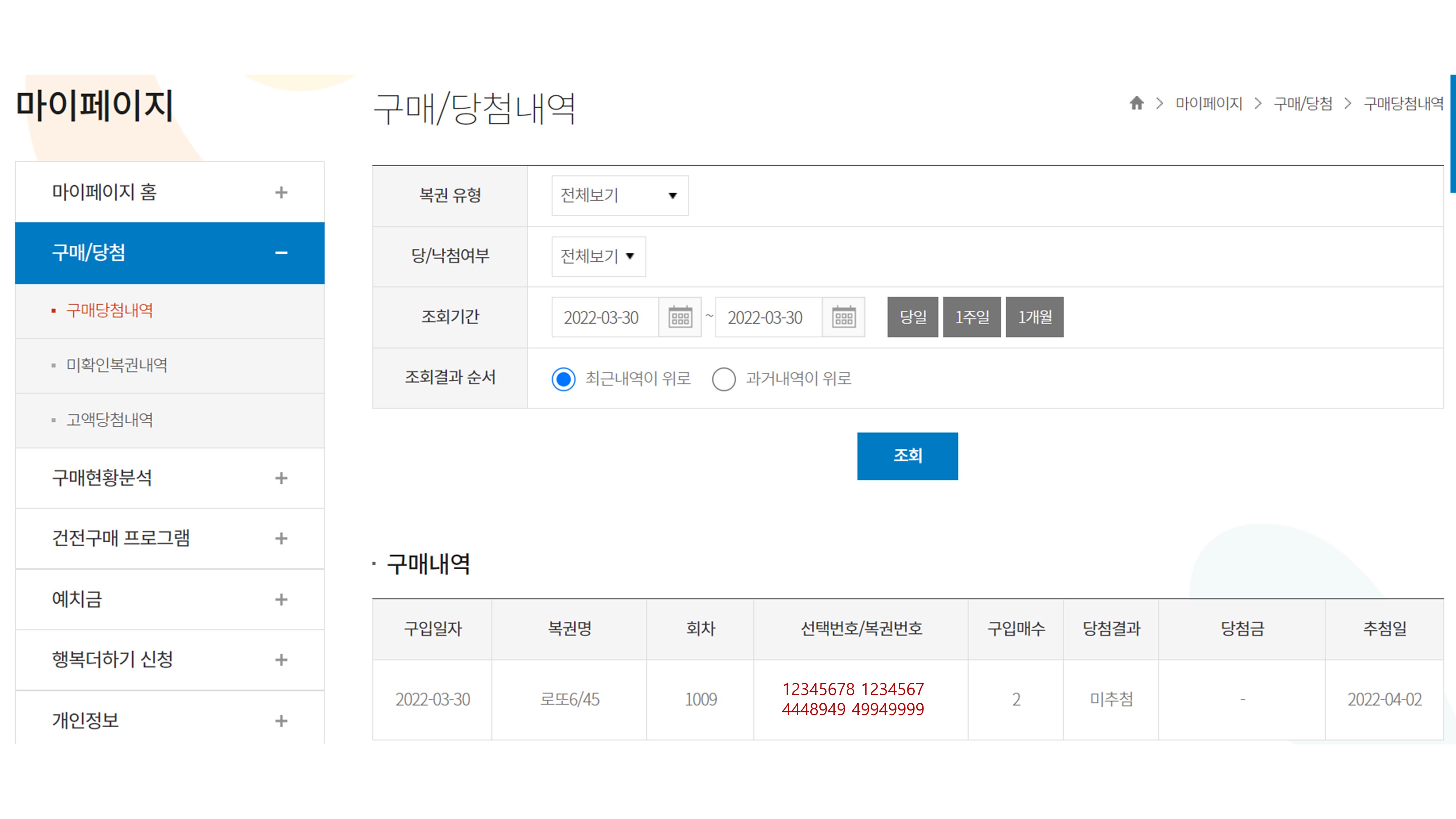 -> 복권 구매와 당첨내역은 마이페이지에서 확인이 가능합니다.