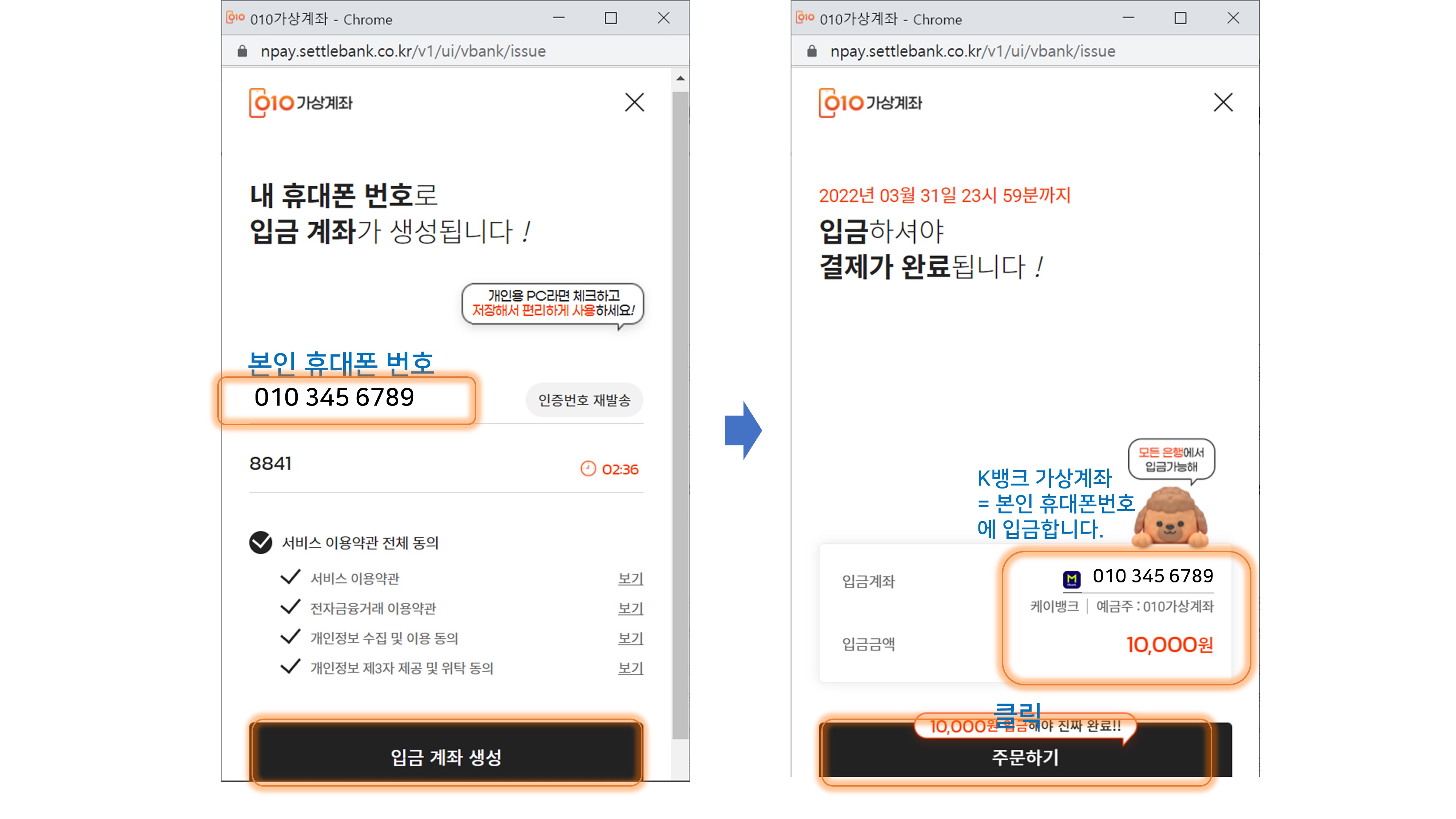 -> 본인의 휴대폰 번호로 K뱅크 가상계좌가 생성됩니다.