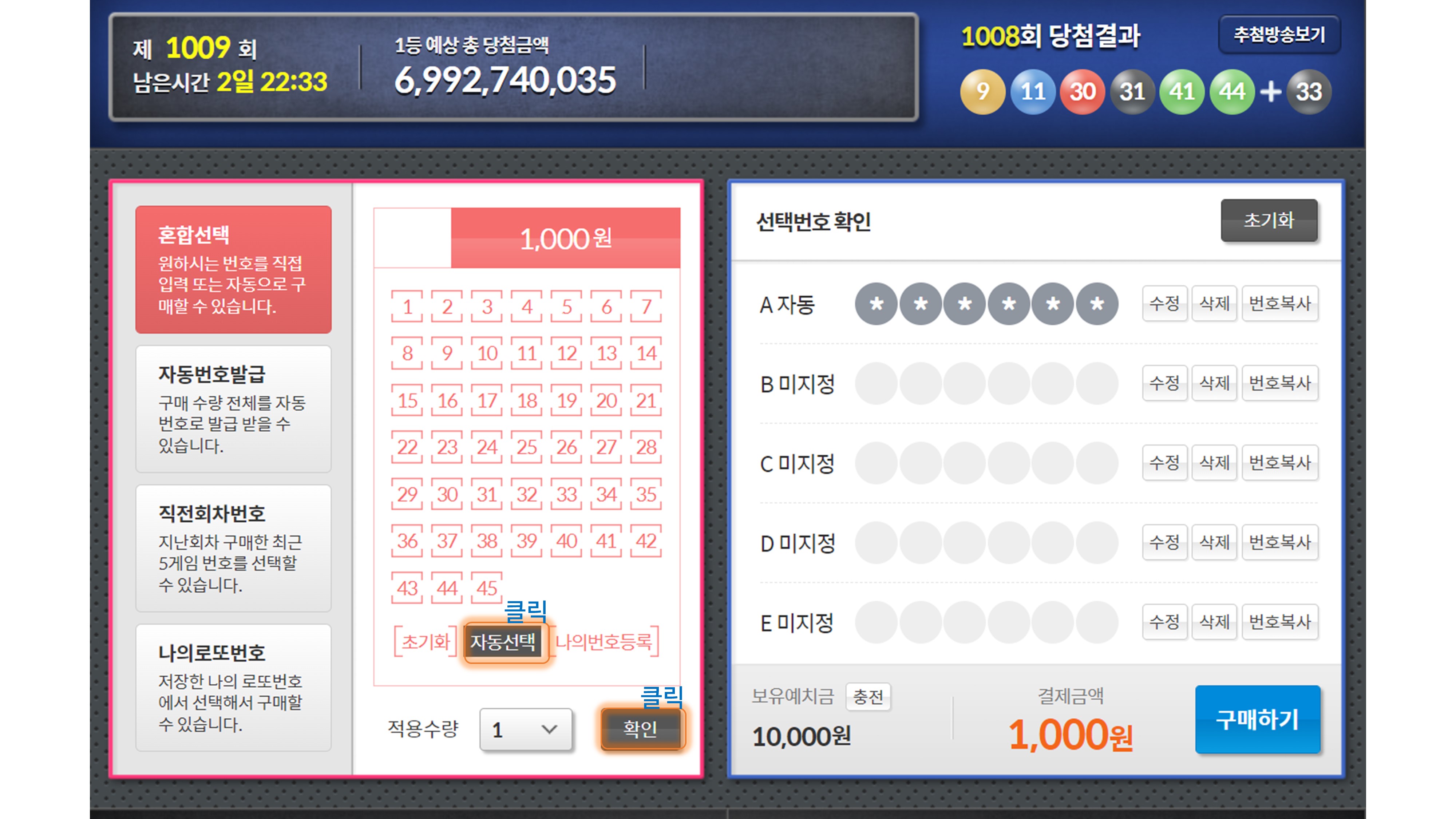 -> 자동선택 복권은 위의 사진과 같이 "자동선택"을 클릭하고 "확인"을 클릭하시면 됩니다.