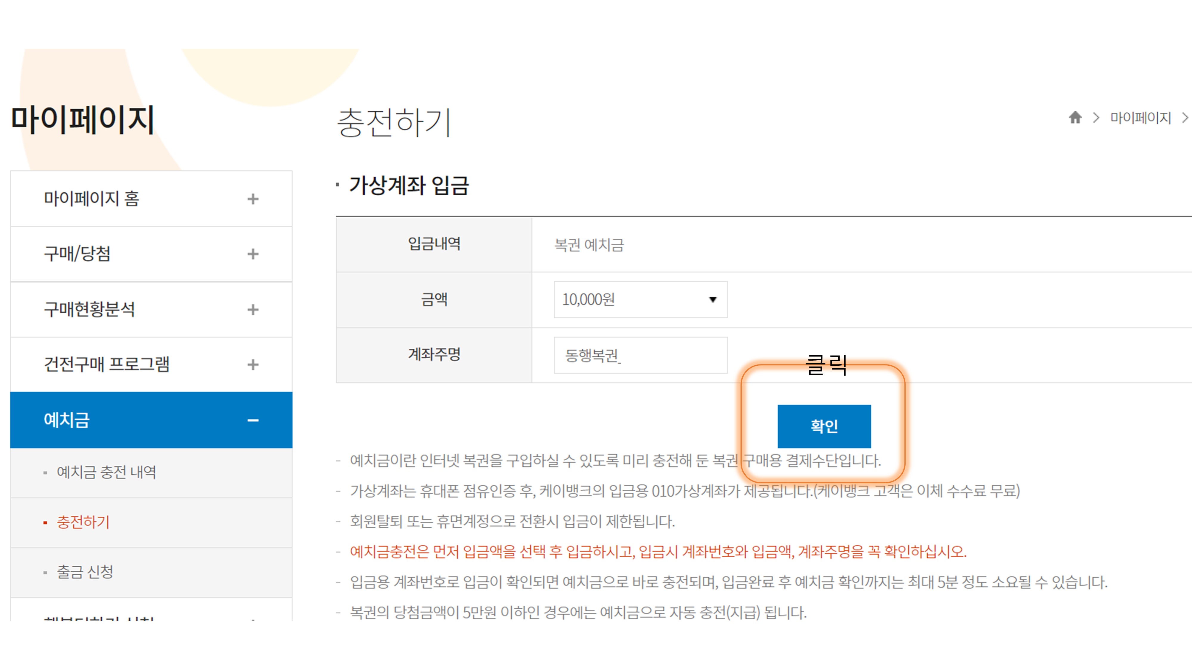 -> 복권을 사려면 예치금을 충전해야 합니다.