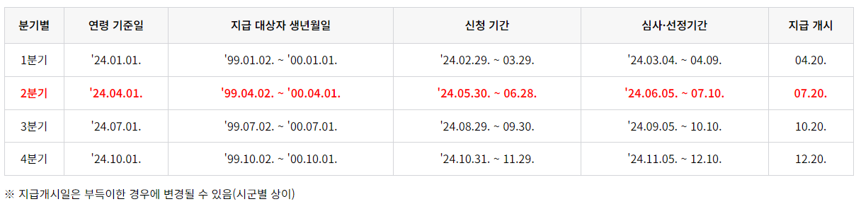 2024년 4월 1일 기준으로 24세 청년에 한해, 지난 분기 미신청분 추가 신청이 가능합니다.