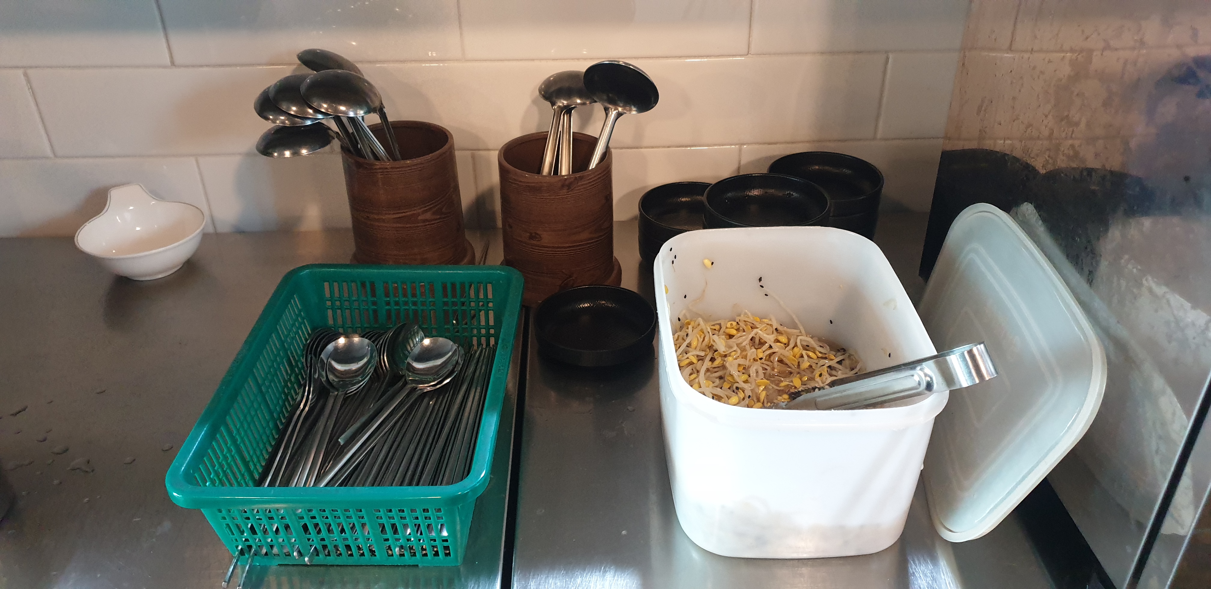 ▶ 아래 사진처럼 밥과 반찬(콩나물)을 무한 리필할 수 있도록 되어있습니다.  한참 자라나는 청소년들은 저렴한 가격에 양껏 먹을 수 있어서 좋을 것 같습니다. (밥, 반찬, 수저, 개인접시 등은 셀프이니 참고하세요)