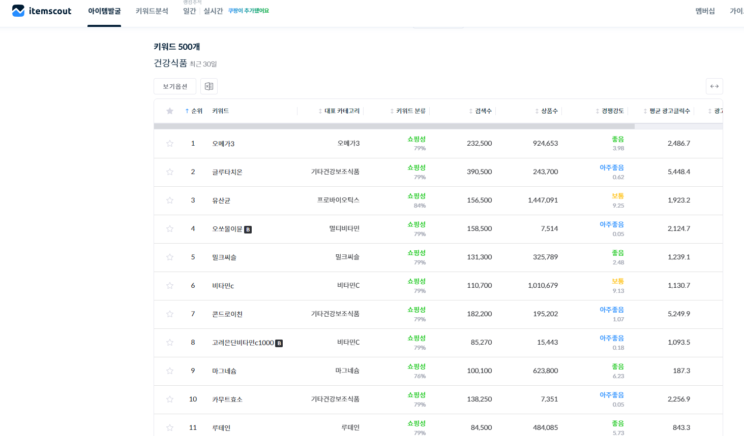 3. 경쟁강도는 어떤가? --> 검색량은 많은데 상품수가 적은 제품이 좋음