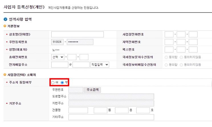 자가소유의 경우 '여'를 선택하면 본인 주소지가 나옴, 사업장을 임대한 경우 '부'를 선택하고 주소를 입력한다.