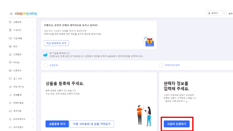 쿠팡윙에서 '사업자 인증하기' 클릭