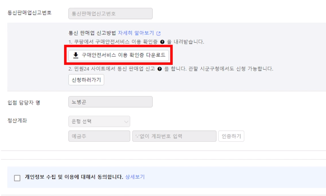 - 발급받은 통신판매업 신고번호를 등록한다.