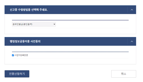 - 신고증 수령방법은 온라인과 방문수령 방법이 있습니다. 원하는 방법 선택