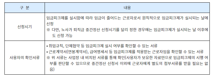 - 연간 임금총액 산정 기준: 중간정산을 신청한 가입자의 연간 임금총액은 직전 연도 임금의 총액으로 산정합니다.
