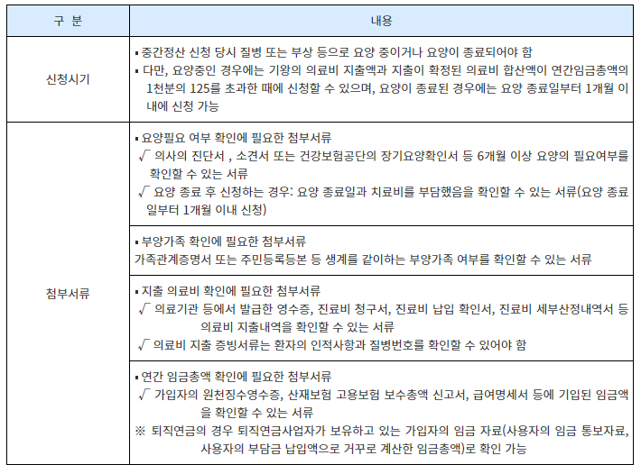 중대한 질병이나 부상으로 인한 고비용의 의료비가 필요한 경우에도 중간정산을 신청할 수 있습니다.
