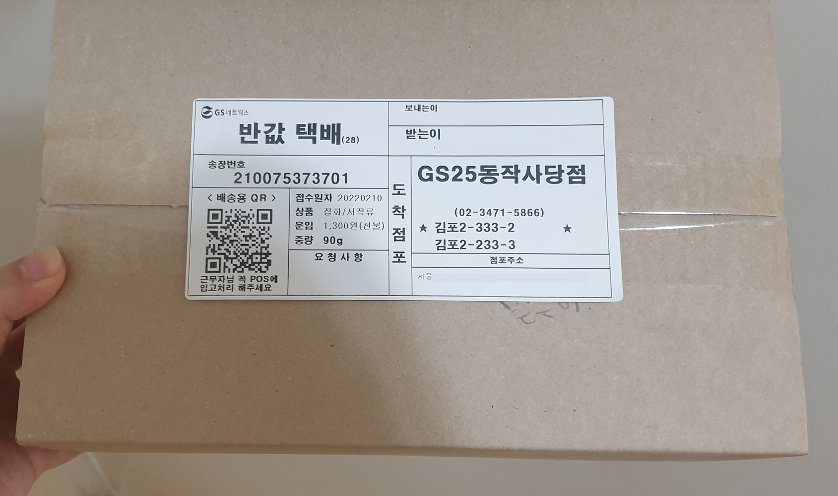 - 접수 가능 물품 : 중량 10kg 이하, 세 변의 합 1.0m 이하 가로+세로+높이, 물품가액 50만 원 이하 (그밖에 접수 제한 물품이 있으니 GS postbox 사이트에서 확인해 보시는 걸 추천드립니다.)
