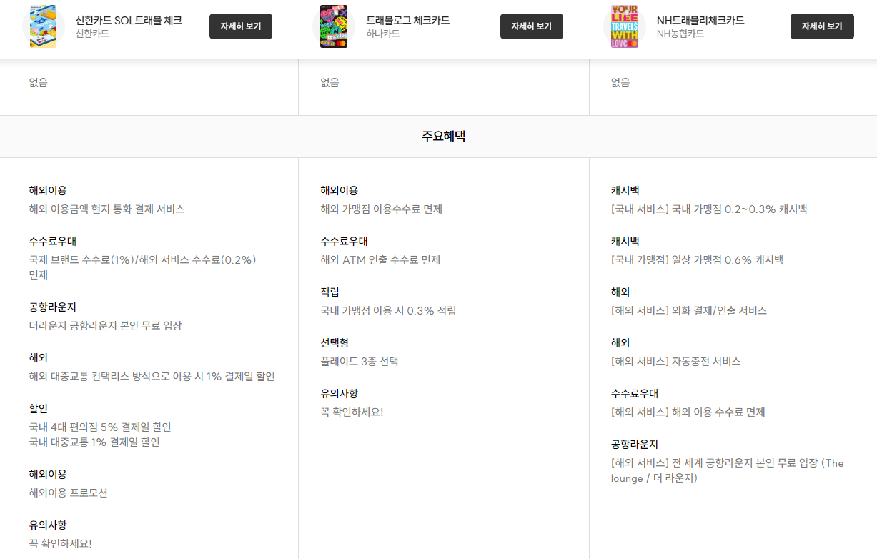 신한솔 트래블 vs 하나 트래블로그 vs NH트래블리 체크카드 비교