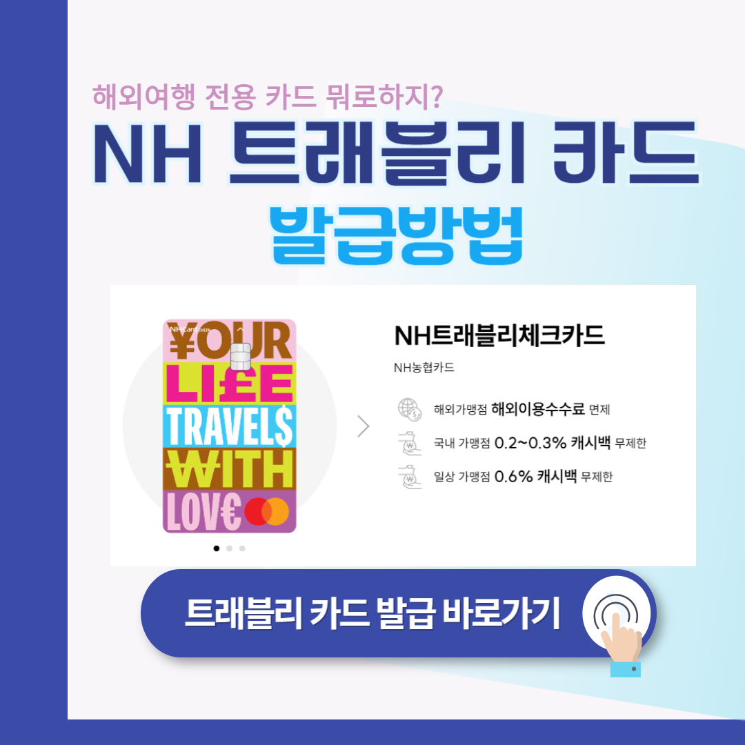 NH농협카드의 트래블리 카드는 해외여행을 더욱 편리하고 경제적으로 만들어주는 다양한 혜택을 제공합니다. 더 자세한 정보나 카드 신청은 NH농협의 공식 웹사이트나 앱을 통해 확인하실 수 있습니다. 여행 준비를 하시는 분들에게 적극 추천드리는 카드입니다.
